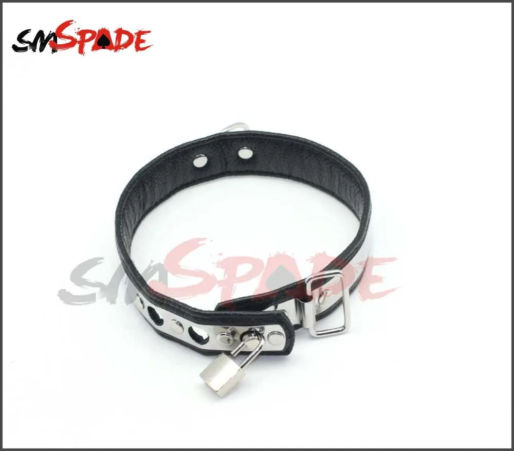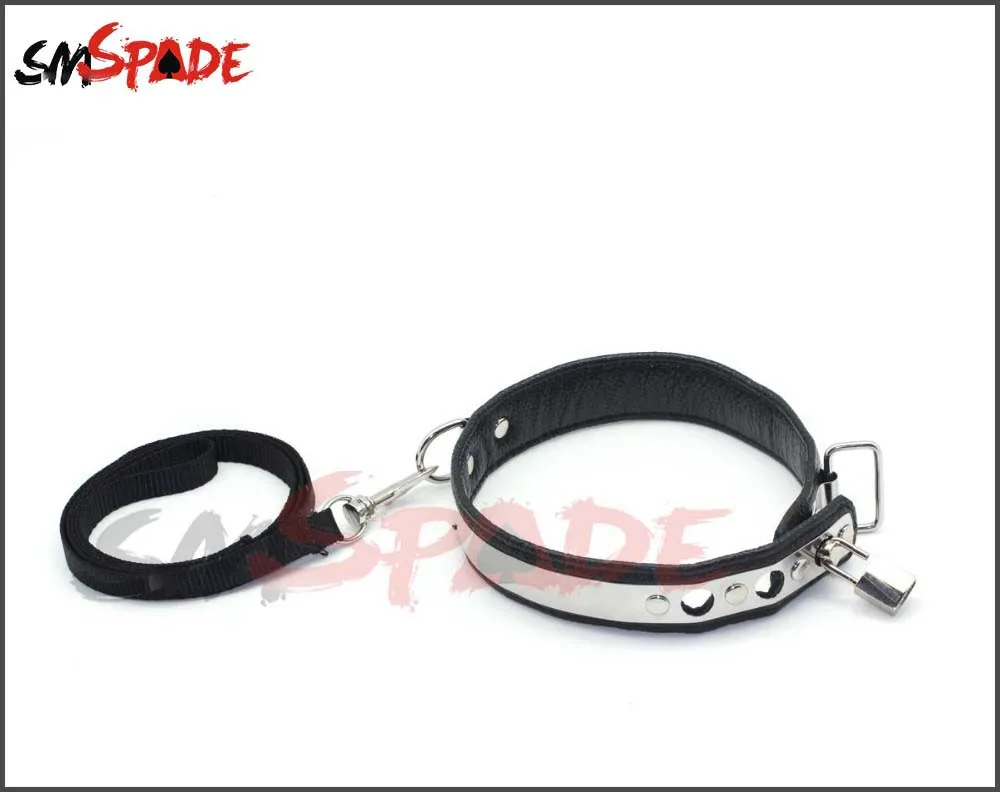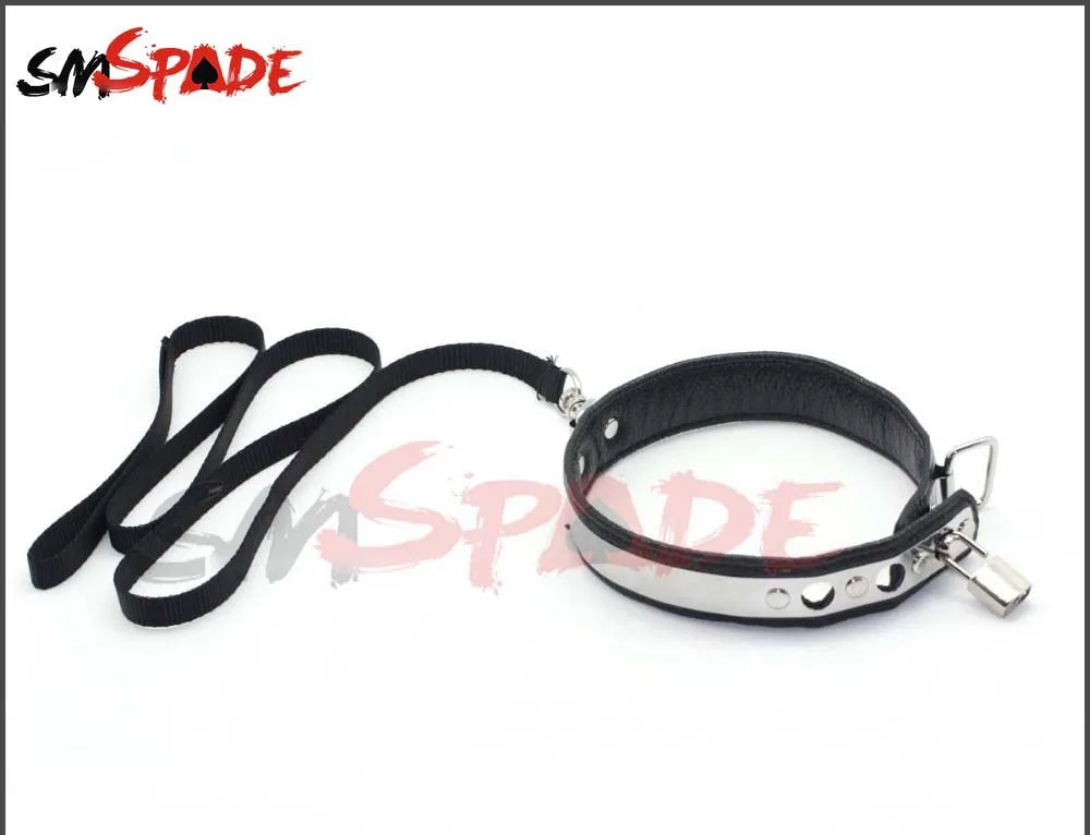 Silver metal collar with padLockleather bondage restraint neck collar for sex gameslong webbing lea
